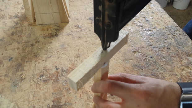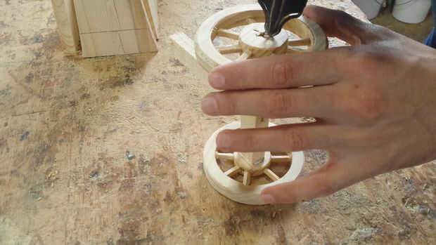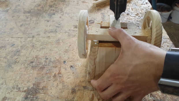 Con dos trozos de madera 1.6 x 2.0 x 12 cm hacer una construcción de forma de T (foto 2). Colocar las ruedas en cada lado y asegure con pegamento y clavos. Por último colocar el cubo como se muestra (foto 4)