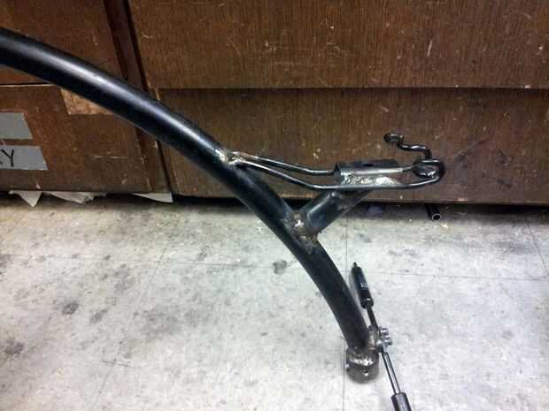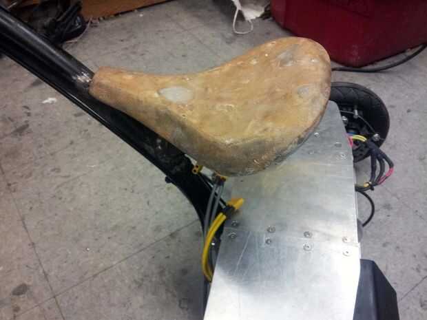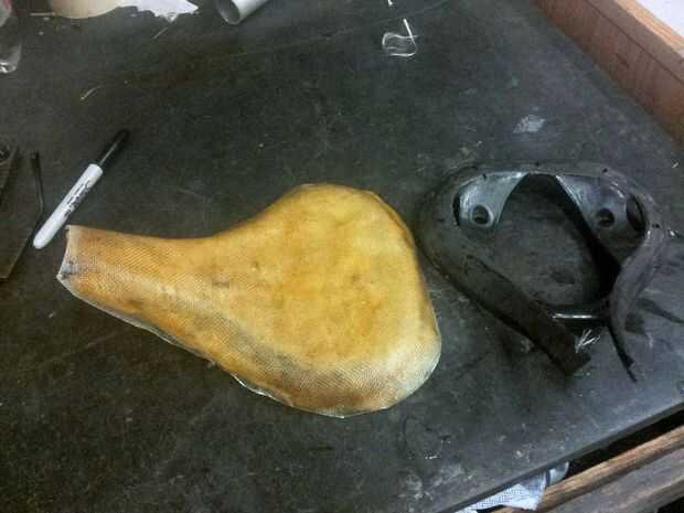Para hacer la superficie del asiento, moldeados sobre la estructura de plástico con tela de fibra de vidrio mojado hacia fuera en epoxy. Todo lo que tenía era epoxy de 24 horas, así que para curar más rápidamente, puse el asiento en un horno a baja temperatura (200 f). Esta disminución curado tiempo de epoxy alrededor de una hora del 24. Por desgracia, empecé con una variedad diferente de epoxy, que reaccionaron mal a la alta temperatura de curado. Espuma para arriba y se volvió naranja, pinté sobre el asiento en negro para cubrir el color de epoxy desagradable. Las irregularidades fueron fijadas por lijar y rellenar huecos con epoxi espesado.
