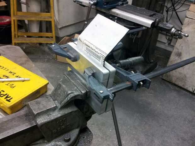 Para cubrir el compartimento de las pilas, hice una cáscara doblando algunos mate acrílico negro y pegado a la chapa superior sobre el compartimiento de pilas. Para doblar el acrílico limpiamente, fijar bloques de aluminio grande justo por encima y por debajo de la línea de plegado y calienta la línea con una pistola de calor. Los bloques de aluminio soporten acrílico mientras lo doble y también mantener el material que no quiere enfriar la curva.