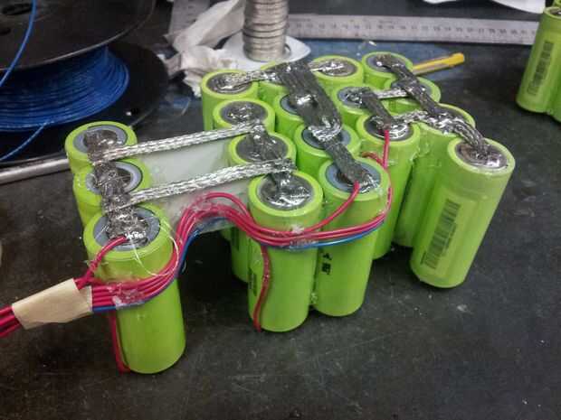Para construir el paquete, empecé a organizar las células en grupos de tres, virar con pegamento caliente y las células en paralelo con trenza de cobre pesado de soldadura. Luego pegan estos módulos y soldadas en serie con la trenza más. El paquete de baterías de 12 años se organizó en dos capas, cada una de ellas era un paquete de 6S. Esto me deja usar conectores de balance 6S, puesto que no puede equilibrar mi cargador cargar un pack de 12 años.