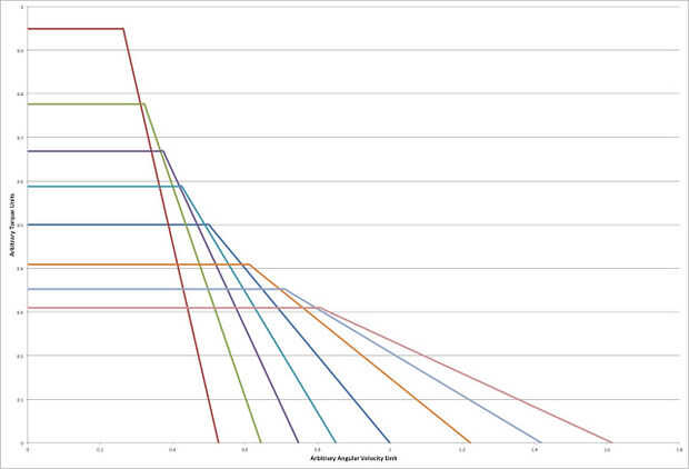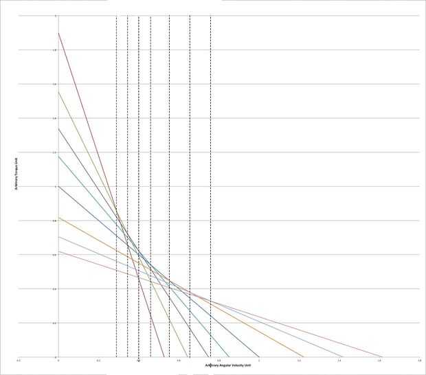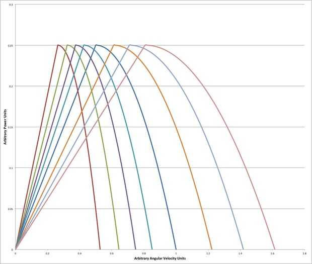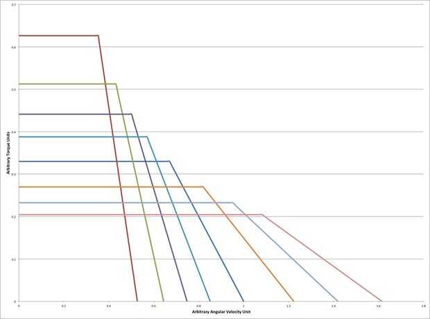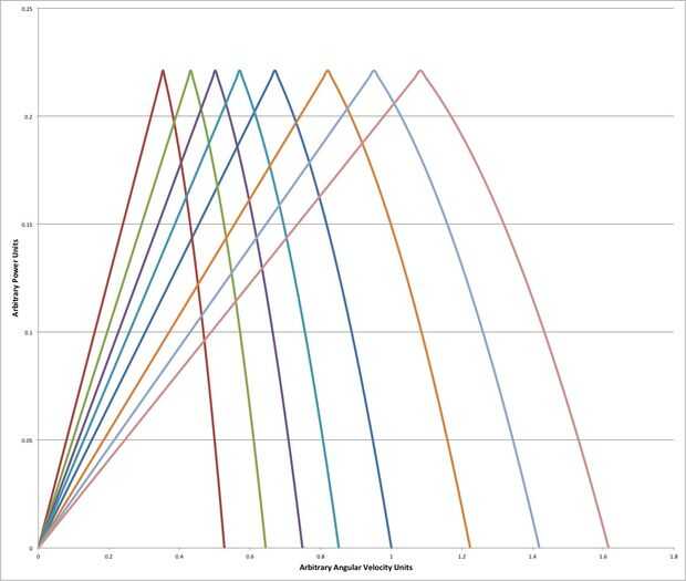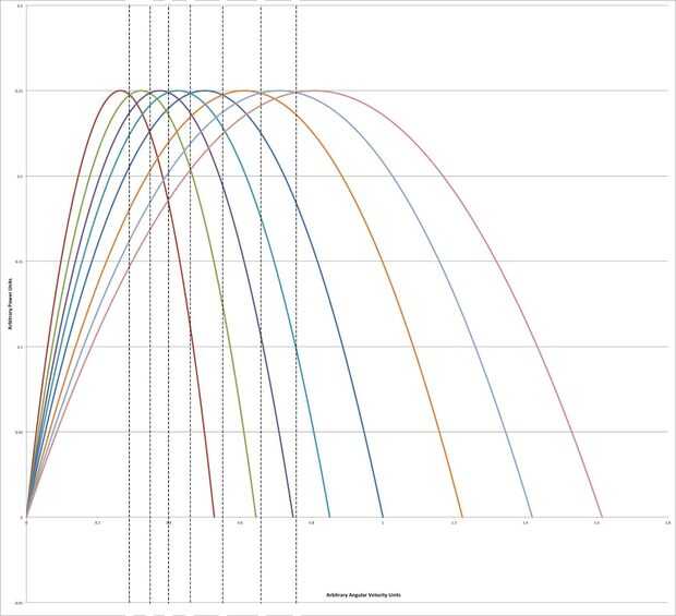 Aquí es donde las cosas comienzan a conseguir interesantes. Través de una reducción de la impulsión de cadena, el motor conduce una ocho velocidades Shimano interno engranaje eje. Vehículos más eléctricos, las comerciales como las de Tesla incluido, sólo tienen una velocidad. Para obtener el máximo provecho de un motor como este, realmente tiene sentido tener engranajes múltiples. Al igual que un motor de combustión interna, motores eléctricos tienen velocidades de rotación para la potencia óptima o la eficiencia. Mediante el uso de una caja de cambios, el motor puede mantener cerca de estas velocidades para una amplia gama de velocidades del vehículo. Esto se ilustra en el par motor vs rpm y potencia vs rpm curvas que se muestra en las fotos. La caja de cambios se cambia de puesto con una montaña bicicleta estilo gatillo palanca de cambios montada en el manillar