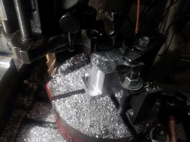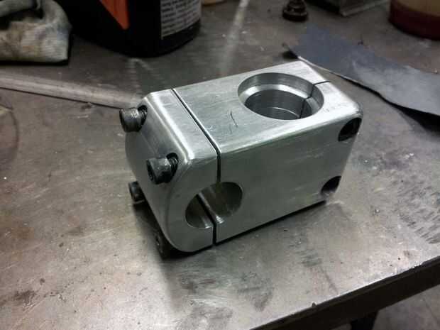 La madre se aferra a la horquilla y el manillar por sujeción a ellas. Para hacer las abrazaderas, aburren primero agujeros para el diámetro correcto para el manillar y tubo de dirección. Hice estos agujeros primero perfore agujeros guía con una broca de taladro, y después usando un cabezal para precisamente acabar los agujeros. Perforado y golpeado ligeramente los agujeros para los tornillos de sujeción y cortan las ranuras en el tallo en una sierra de cinta. Cuando los pernos estén apretados, las ranuras permiten que el tamaño de los agujeros para disminuir, pudiendo llegar a la horquilla y el manillar.
