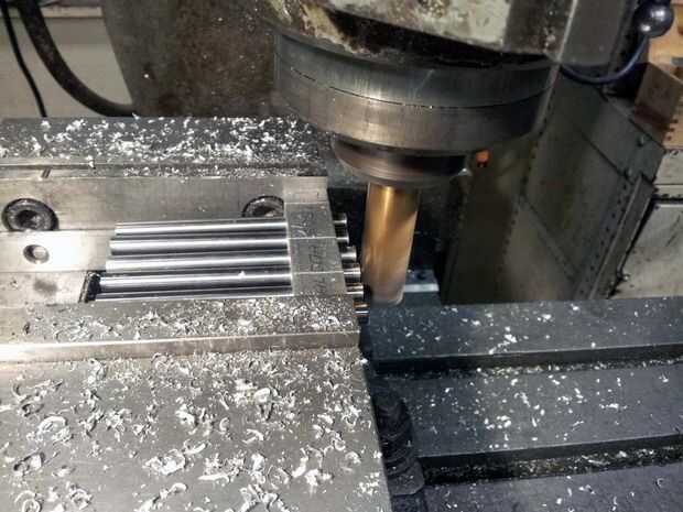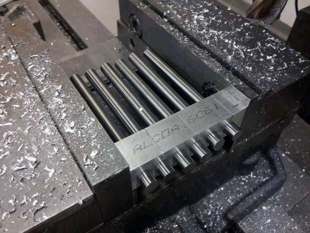 El diferencial es atravesado por seis varillas de acero de precisión. Estas barras tanto mantener todo Unido y como los ejes de los engranajes de estímulo de cuatro. Para asegurarse de que estas barras eran todos exactamente la misma longitud, me enfrenté a sus extremos simultáneamente en el molino. Para ello, seis agujeros a través de alguna acción de aluminio cuadrados perforados y corte una ranura en cada orificio. Cuando las varillas se insertan en los orificios de la culata y la culata se fija por sus extremos, las ranuras comprimirán y sostenga todos seis barras simultáneamente. Los extremos de las varillas fueron agujereados hacia fuera y aprovechados a 10-32.