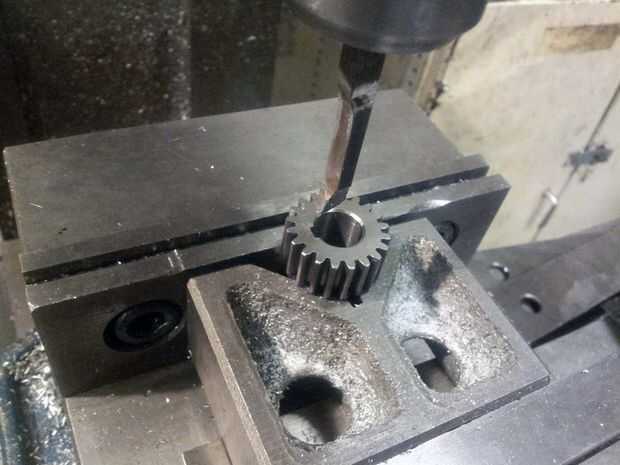 Los engranajes de la salida de 20 dientes recibí de McMaster llegaron sin un chavetero en ellos. Puesto que no tenía una 1/8" brocha para hacer un chavetero, tierra mi brocha de un solo punto de un acero de herramienta de torno. Usando el molino, repetidamente presiona la brocha a través del paso de la marcha, lentamente de progreso la cama molino cada paso.