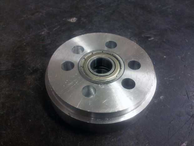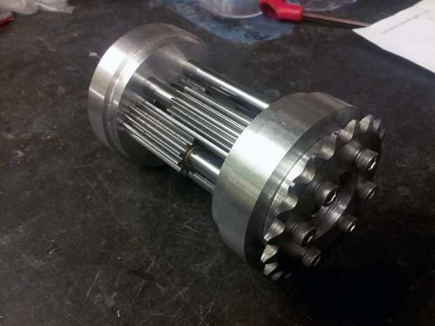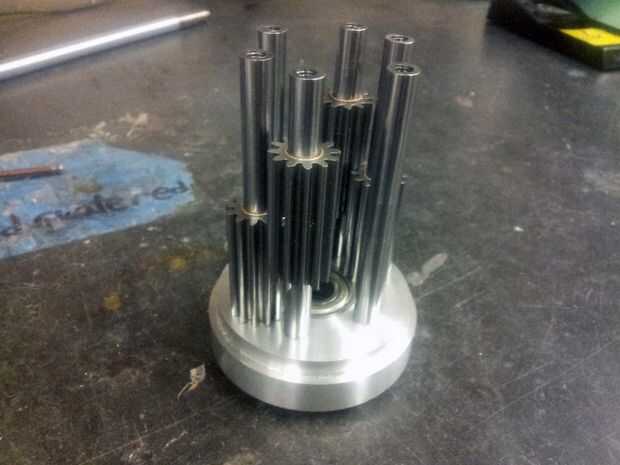 El diferencial es bastante sencillo de montar - las varillas se insertan en sus respectivos agujeros escariados en una tapa, los engranajes y los espaciadores se colocan en sus ejes, los ejes y los engranajes de salida se insertan, y la segunda tapa se coloca en. Para mantener el diferencial verdadero, que tuve que secuencialmente, apriete los tornillos en el perímetro - esto significa apretar gradualmente frente a pares de tornillos, para que el tapón no está tirado a un ángulo. El engranaje es sostenido en lugar por los mismos tornillos que sujetan el diferencial.