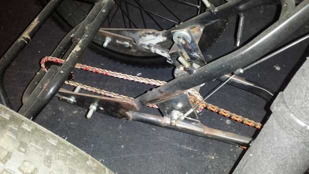 Soldadura a la cadena de estancias donde no interfiriera con cualquier cosa y tratan estos temas tanto al mismo tiempo doblando algunos soportes de acero de 1/8" placa de acero suave. Este marco de la bici ya no es usable como un marco de bicicleta, por lo que no importa que estos soportes son ahora justas donde debe ir la rueda.