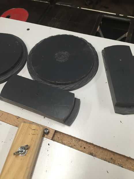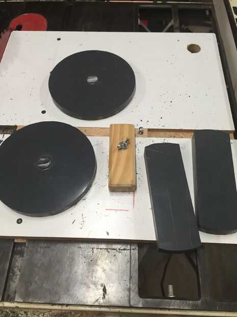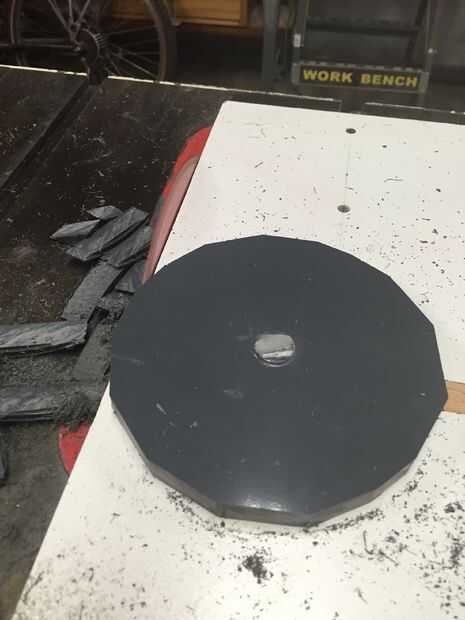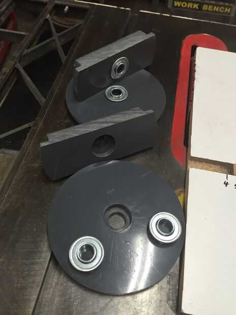 Configurar la plantilla de corte del círculo para el Hanon cortar un círculo ligeramente más pequeño que el diámetro exterior de la tubería de PVC. Alternativamente se puede utilizar una sierra de cinta o de vaivén, pero manteniendo los cubos redondos y los cojinetes centrados se vuelve más difícil. Corte un total de cuatro círculos. Sólo tenía lo suficiente para dos círculos, así que me fui con dos barras gruesas de los hubs exterior. Doblé las puntas para el mismo diámetro que las placas del círculo.