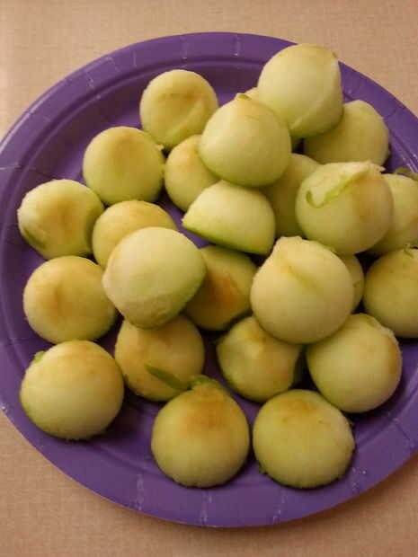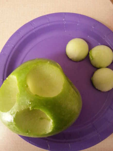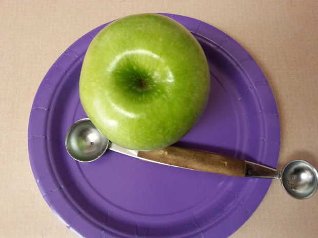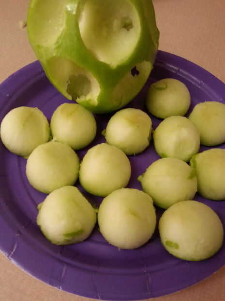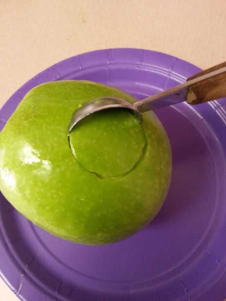 Mientras el horno se está calentando, utilice al baller de mellon a la bola de sus manzanas. Pude obtener 10-12 bolas de manzana de cada manzana. Meter un palillo en cada bocado de manzana.