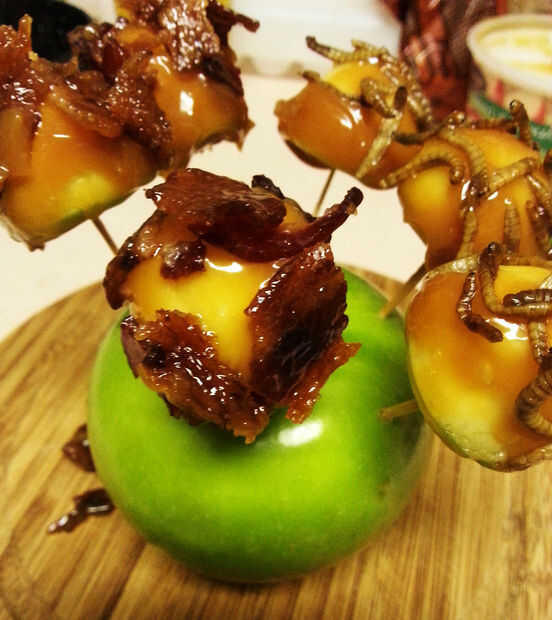 Las mordeduras de la manzana en el caramelo de la inmersión, después rodarlos en cualquiera de los pedacitos de panceta confitada, o los gusanos de la harina o ambos! Si desea, se pegan las mordeduras manzana a otra manzana para una presentación única y divertida.