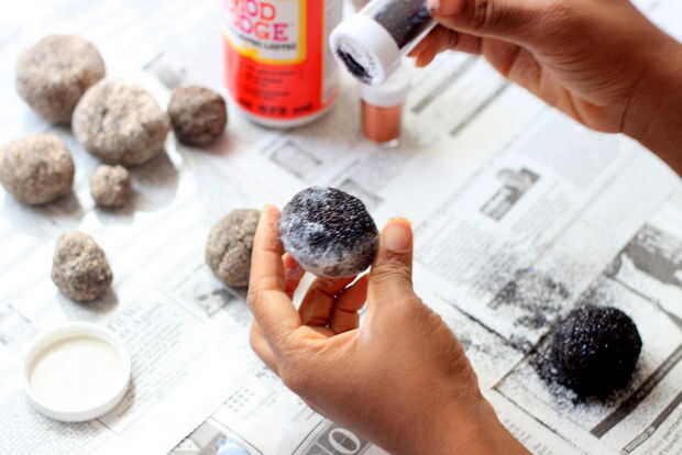 Ahora es tiempo para brillo tus piedras, tu pintura o pincel de espuma de poliestireno y moje en el pegamento, el pegamento en las piedras (hice una piedra a la vez) de la capa. Espolvorear glitter todo tus piedras cubriendo la piedra entera con brillo. Deje que se seque, una vez que se realizan en secado spray con un spray acrílico las piedras.
