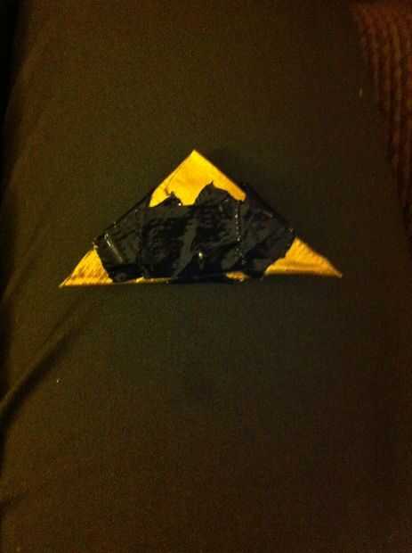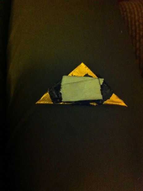 Para este paso, usted puede cualquier uso pegamento o conducto cinta (yo usé cinta adhesiva porque era más fácil y más rápido que el pegamento). Dé vuelta la cinta Trifuerza y enrollar alguna cinta adhesiva para que ambos lados son pegajosos. Presione la cinta adhesiva en la parte posterior de la Trifuerza y prepárate para los pasos finales...