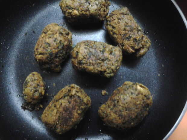 Procedimiento - lavar y picar la verdura verde, poner harina de trigo gruesa. El agregar Chile en polvo, polvo de la cúrcuma, polvo de coriandro, asafoetida, aceite y amasar una masa.
