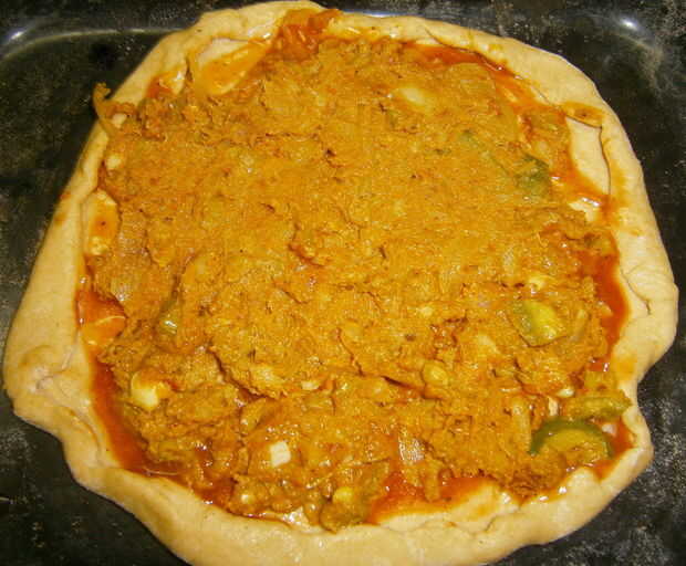 Extender la salsa de tomate. Añadir el relleno con queso cottage.