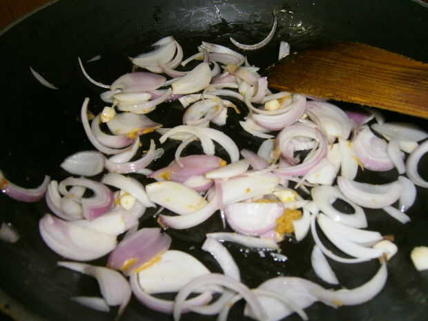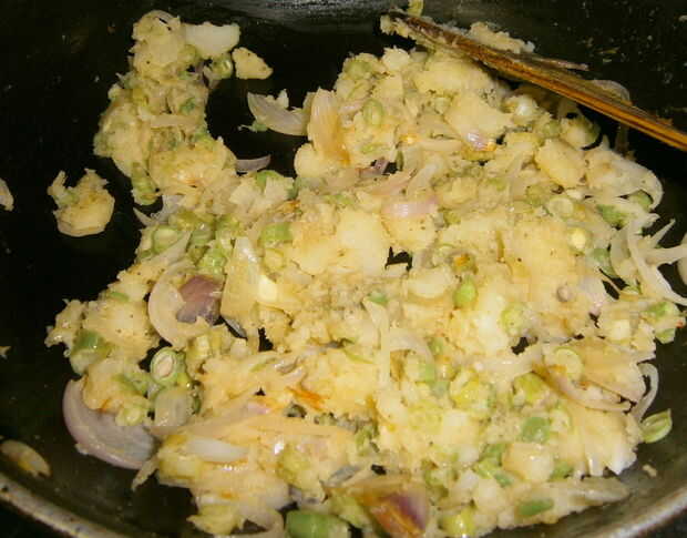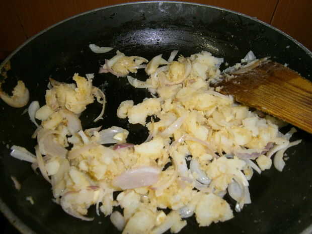 Tome unas gotas de aceite en sartén. Saltear ajo y cebolla juntos. Añadir el puré de patatas y rehogar durante 5 minutos hasta que se tuesta.