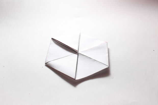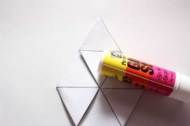 Por último, coloque el lado izquierdo debajo de la derecha (o viceversa) y debe ser un triángulo que sobresale en la parte superior. Aplique pegamento en los triángulos de dos y luego doblar el triángulo hacia abajo (ver fotos de referencia).