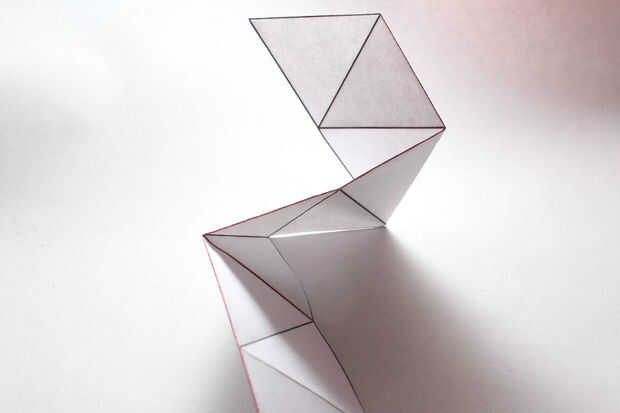 Cómo se orientan los 10 triángulos es importante: mantener la tira de papel con la esquina superior del triángulo izquierdo lejos de usted. Debería verse como la primera foto.