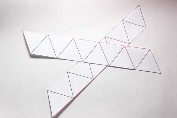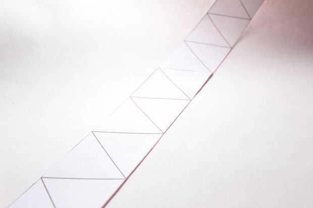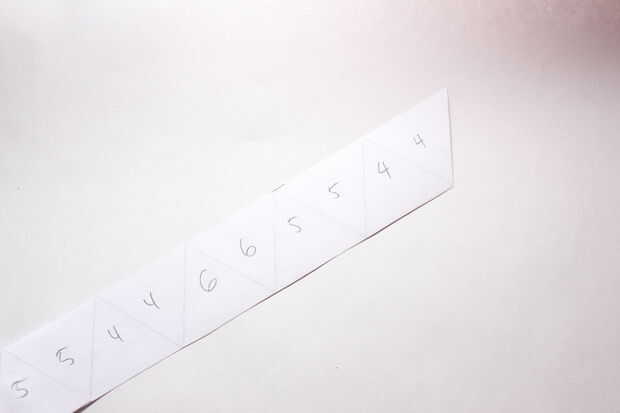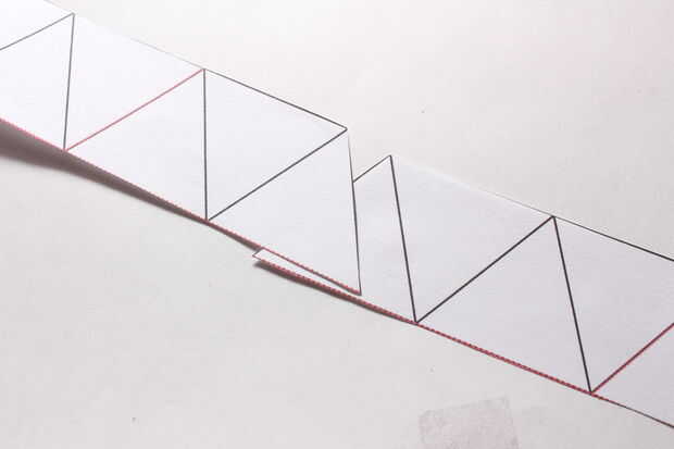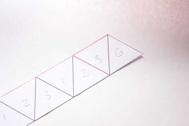 Comienza por cortar la plantilla hacia fuera similar a la trihexaflexagon pero esta vez, corta la línea media para dividir el papel por la mitad. Esto creará dos tiras con 10 triángulos. Tome las dos tiras y aplique el pegamento a la parte posterior de uno de los triángulos (lado sin nada impreso en él). El triángulo debe hacer frente con su parte superior mirando hacia fuera. Ver la tercera foto para referencia. Esto resultará en 19 triángulos en una larga hilera. Luego con el triángulo de la izquierda apuntando lejos de usted, comienzo a contar los triángulos 1,2,3,1,2,3,1,2,3...