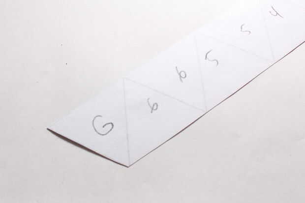 Al final, habrá un triángulo extra al final; poner la letra 'G' de ese triángulo. Dé vuelta el triángulo en su borde largo y luego empezar con 4,4,5,5,6,6,4,4,5,5,6, 6... de derecha a izquierda (los primeros 4 debe estar en la parte posterior de la G) hasta el final donde su escritura 'G' otra vez. (Ver las fotos de referencia).