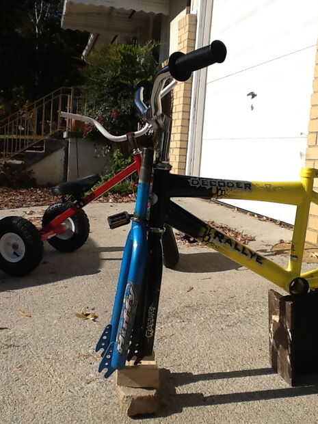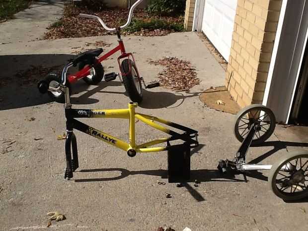 Una vez tuve la idea de trike loco en mi cabeza, presentado algunas de las partes para ver lo que necesitaría para hacer el trabajo. Primero quita la horquilla y el manillar de la bicicleta para niños y había sustituido con un tenedor más grande y el manillar diferente. Si usted es nuevo a trabajar en bicicleta y cualquiera se encuentra con un montón de bicicletas de su propia o querer acumular un montón de bicis, sólo tener en cuenta que no todas las piezas serán intercambiables, y si no tienes las herramientas y conocimientos para que todo ajuste que quieras, puede que necesite cuidado de los tamaños y estilos de bicicletas te. Esto puede limitar el tipo de proyectos que podrá completar.