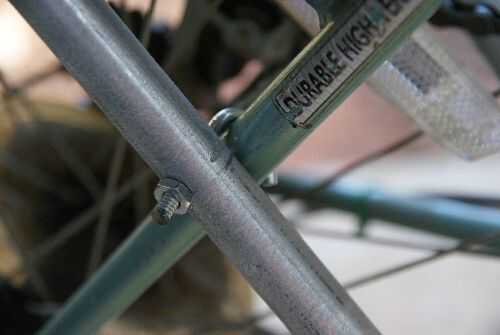 Se extiende una segunda pieza de 3/4" EMT se suelda con autógena a dos 1/2" EMT apoya que se extienden hacia abajo en cada lado de las estancias de la rueda delantera. Ganchos "J" se utilizan para asegurar estos apoyos a las estancias del asiento y la cadena queda (Foto #3, #4 y #5).