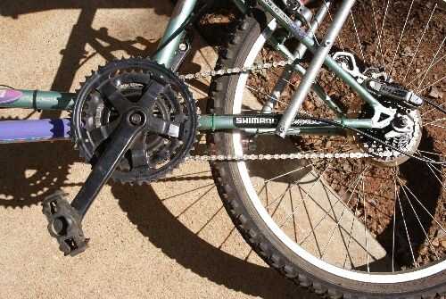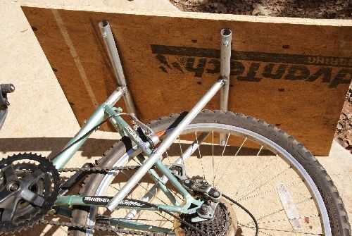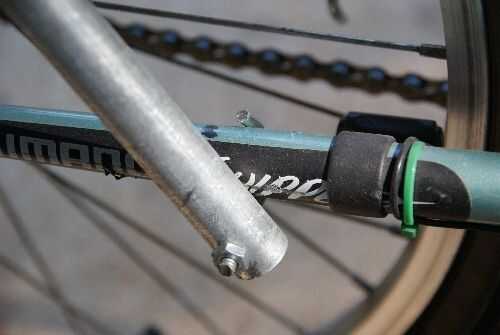 Una pieza de 3/4" EMT conduit está soldada a la parte superior de otra pieza de 3/4" EMT que desliza hacia abajo en el tubo del asiento sobre la rueda delantera (Foto #2) y se fija con pernos en su lugar.
