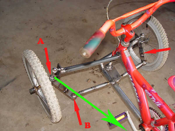 Para la dirección frontal para que funcione correctamente mientras que las curvas, la rueda interna debe girar más agudamente que la rueda exterior (la rueda interior hará un arco mayor que la rueda exterior). Esto se explica mucho mejor por verdaderos expertos que pueden encontrar via google. Para lograr estos diferentes arcos de torneado aplicamos el principio de Ackerman. La versión de Cliff Notes de Ackerman afirma que el capo (A) y la articulación de la dirección (B) deben colocarse para que una línea puede ser dibujada (flecha verde) que pasa a través de A y B y cuando extendida, pasa por el centro del eje trasero. Puesto que el pivote y el eje trasero están en posiciones fijas, la articulación de la dirección (B) es el punto que debe ser manipulado para crear éxito dirección Ackerman. Esta articulación se mueve cambiando el ángulo y la posición del brazo de dirección antes de que permanentemente está soldado al eje. Una vez que se suelda con autógena en la posición correcta que los tirantes se ajustan para que las barras de la manija son centradas cuando las ruedas están mirando hacia adelante.