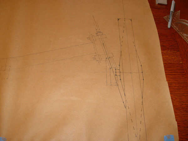 Cualquier construcción de un trike del tadpole (dos ruedas delanteras y una trasera) debe prestar mucha atención a la parte delantera y diseño del manejo, particularmente el rey perno ángulo, la cantidad de ruedas y el principio de Ackerman. Una búsqueda en internet le explicará estas necesidades mucho mejor que nosotros en este espacio limitado. Nuestro diseño especial incorporará 15 grados del rey perno ángulo de 15 grados de rueda y que cumplen con el principio de Ackerman tan cerca como sea posible. Para asegurarse de que todo se encajan correctamente, primero dibujó un bosquejo de tamaño de vida de la parte delantera entera del triciclo en papel de carnicero. Si se está intentando un diseño de renacuajo por primera vez, le recomendamos tomarse el tiempo para elaborar un plan de tamaño completo.