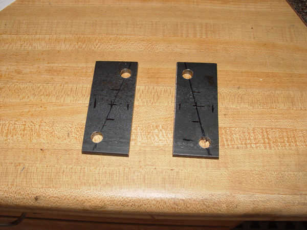 Las placas de apoyo se fabrican con la acción plana de 1/4". Se traza una línea a través de la placa en un ángulo de 15 grados y 3/8 agujeros son perforados en la parte superior e inferior. Esto proporcionará 15 grados de ricino una vez que el mecanismo de dirección. Las placas de respaldo en posición vertical en el travesaño y soldado con autógena en lugar.