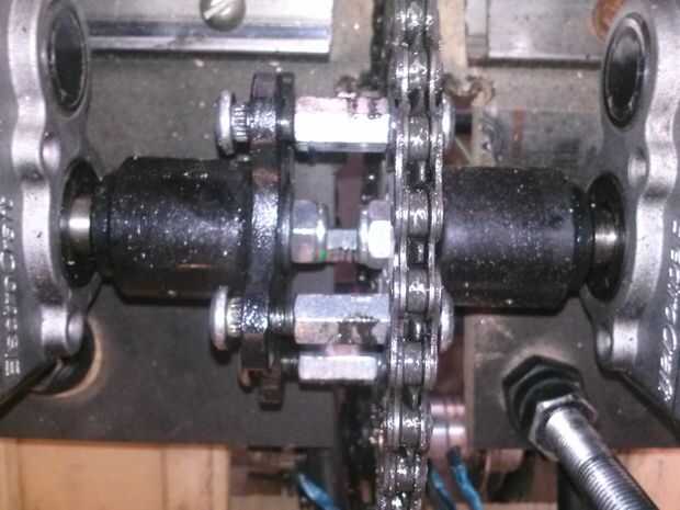 ya que es un powerchair eléctrico con 2 motores y las cajas de engranajes tenían un eje de 5 perno fui a ACE y consiguió algunos acopladores y desenterraron un viejo piñón de una bicicleta de donantes. colocar el piñón entre los centros y los cubos atornillados.