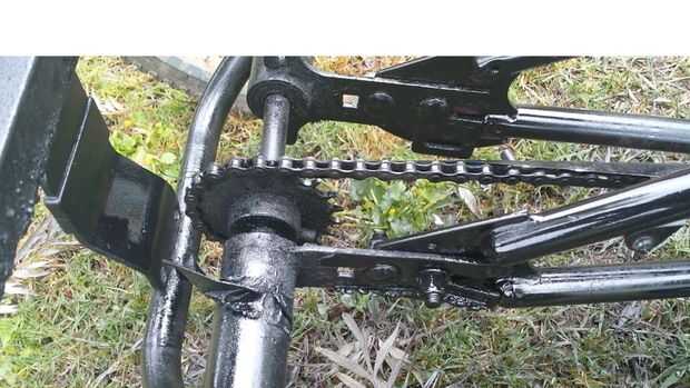 Después de empernar el trike juntos y jugueteaban con las conexiones para hacer la moto lo más recta posible apretó los tornillos. Esta conexión puede no ser lo suficientemente fuerte como para todo el peso que sostiene por lo que yo puedo soldarlo juntos más adelante si es necesario.