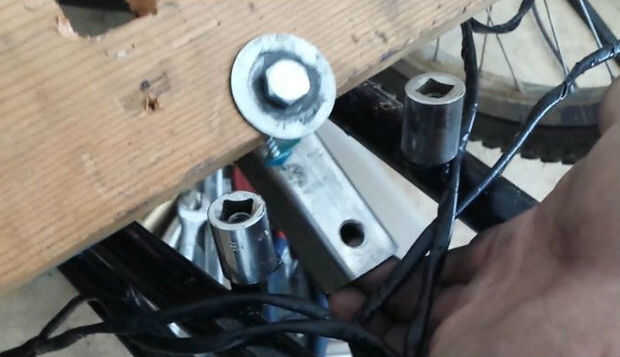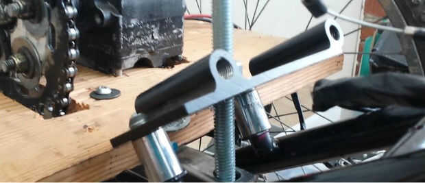 Para mantener la cadena ajustada se perfora el soporte frontal y 6 en larga 5/8 de tornillo se utiliza para conectar a una placa de metal conectada a los viejos soportes de freno trasero en el marco de BMX.