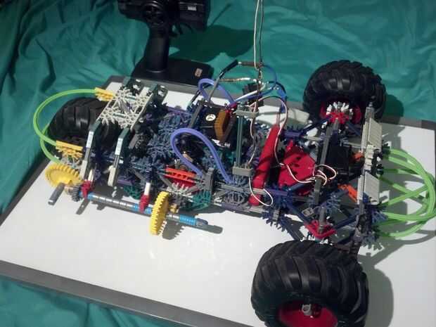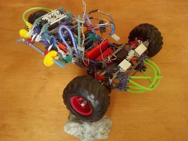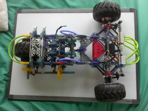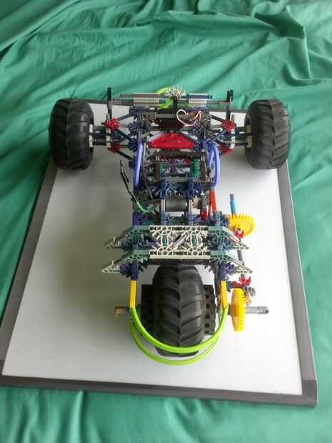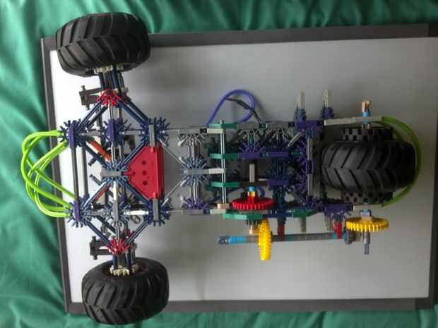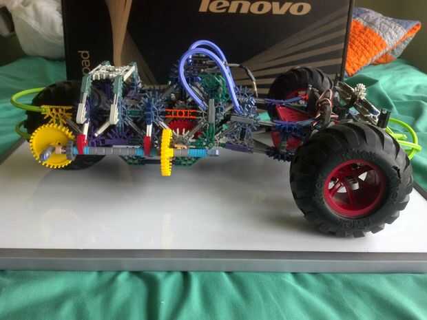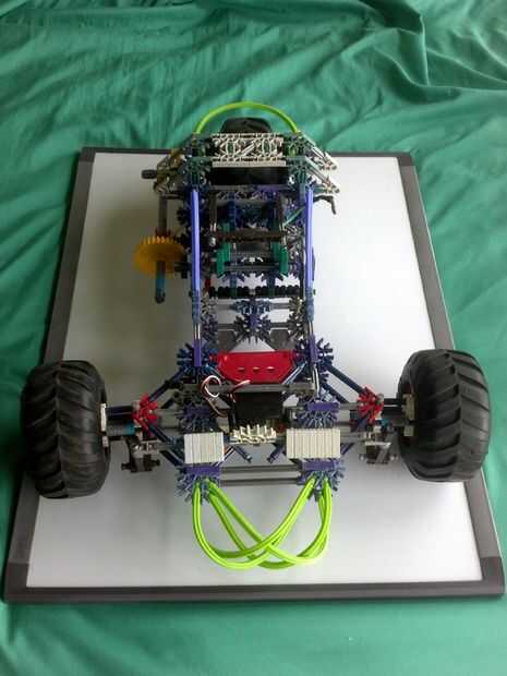 esto es una 4wd K'nex carro con puertas funcionales, un portón, acceso de baterías bajo el capó motor, un volante (dummy), cambio de marchas (dummy), asientos, llanta de repuesto y una cama. El sistema 4wd es rápidamente configurable para la impulsió