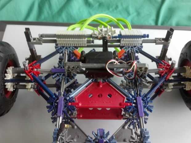 esto es una 4wd K'nex carro con puertas funcionales, un portón, acceso de baterías bajo el capó motor, un volante (dummy), cambio de marchas (dummy), asientos, llanta de repuesto y una cama. El sistema 4wd es rápidamente configurable para la impulsió