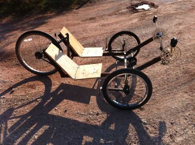 Tuve algunos criterios de diseño cuando empecé. Debe ser menos de 48" de ancho en su punto más ancho para que pudiera montar en amplia aceras y senderos para bicicletas además de la carretera. Porque pedalee a diferentes cadencias, quería que ambas partes tienen engranajes independientes y ser totalmente independientes entre sí (es decir, cada lado puede pedal, o no y cambiar de marcha sin afectar el otro jinete). Pensé que sería bonito que ambos lados podrían 'capitán', y lo ideal sería el cambio de capitán podría realizarse sobre la marcha'. El diseño tenía que ser cómodo para largos paseos, estables en todas las condiciones y manejable con sólo un pasajero cuando sea necesario. También tuve pensamientos de la adición de un motor de gas diminutas, o accionamiento eléctrico en una fecha posterior. Yo quería que él diseño luz y mirando, no como un "paseo de la vieja gente". Quería la suspensión en por lo menos el eje delantero para guardar nuestras espaldas por caminos accidentados. Necesarios para ser aerodinámico, pero todavía lo suficientemente alto para ser visto por automóviles y fáciles de conseguir en. Creo que hemos logrado todos los objetivos. La moto es rápido y divertido. Atrae a una muchedumbre va por todas partes. Es cómodo herramientas junto con los caminantes y volando por colinas. Es ajustable para una amplia gama de tamaños de jinete. La suspensión en las ruedas delanteras hace que el paseo suave y fácil. Cada jinete tiene control de su propia frente y engranajes intermedios y puede seleccionar su rango de proporciones de 21. La transmisión final se selecciona desde el manillar de centro y controla una proporción adicional de 36. Por supuesto, hay muchos duplicados o cerca de proporciones duplicados, pero en teoría, hay 756 ratios para cada jinete. Esto permite una amplia relación con engranajes suficientemente baja como para subir la ladera de una montaña, si es necesario, o lo suficientemente altos que sus músculos son el único límite a la velocidad superior! La posición de conducción cómoda te permite ver todos los monumentos sin agotar le cuello y la disposición de cabina darle opciones de portavasos, soportes de teléfono o un lugar para el libro de su esposa! Si esto suena como un proyecto que le gustaría, me avisas. He desarrollado formas sencillas para garantizar que la geometría de la parte delantera es correcta y muy fácil de construir. Hacer la alineación final marco un broche de presión (y que es muy difícil hacer lo contrario). Es un proyecto grande para desarrollar planes e instrucciones sobre este tipo de proyectos, pero estoy dispuesto si eres!