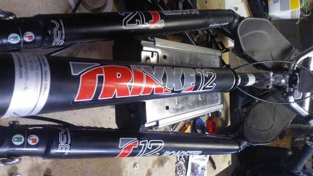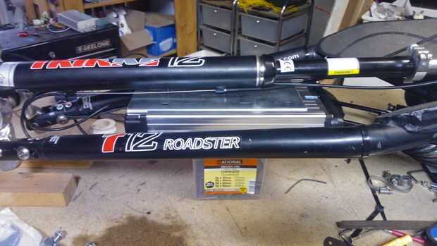 En primer lugar, doblar tu Trikke en un banco o una mesa, utilizando un recipiente o libros, coloque la batería entre el marco contra la columna de dirección. Los bucles de cable de freno sujetan el claro de los cables,