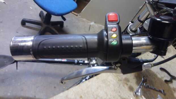 Si tienes un compresor de aire, para quitar las asas originales, utiliza el plumero de aire para inyectar aire entre el manillar y el agarre, el aire libera el mango desde el manillar mediante un efecto de colchón de aire y simplemente se desliza apagado con apenas cualquier esfuerzo. (El nuevo grip pasivo tomó un martillo de goma para instalar, esperamos que la duster aire truco funciona cuando tengo que quitar más adelante).