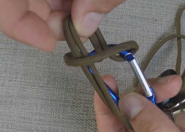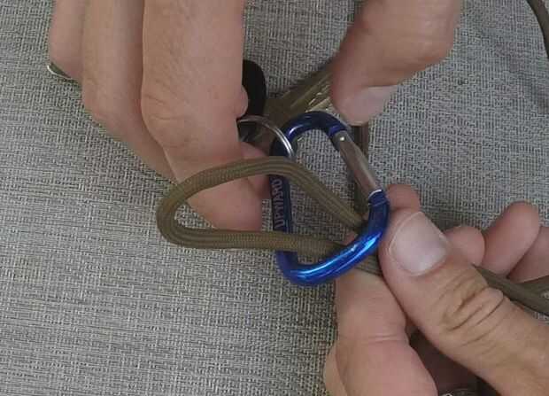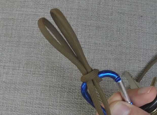 Encontrar el centro de su paracord doblando por la mitad. Mantenerlo dobló por la mitad. Meter una pulgada del extremo del medio a través de un mosquetón, o su llavero.