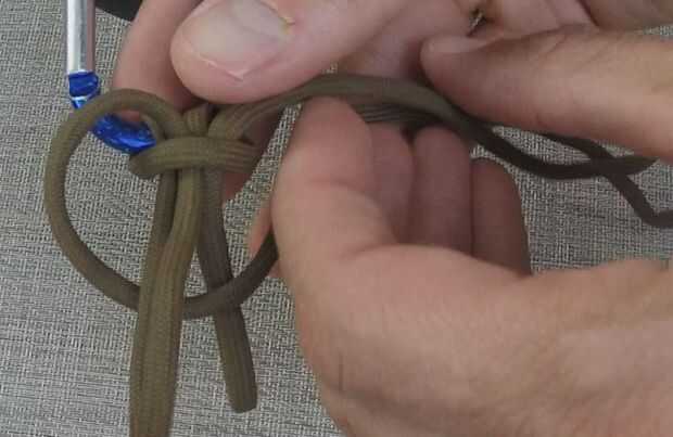 Ahora coge la hebra derecha. Ir por encima de la hebra izquierda, para enlazar, a continuación, ir detrás de la oreja derecha. Ir delante de la oreja izquierda y meter bajo el filamento con que comenzamos. Apriete el tejido apretado.