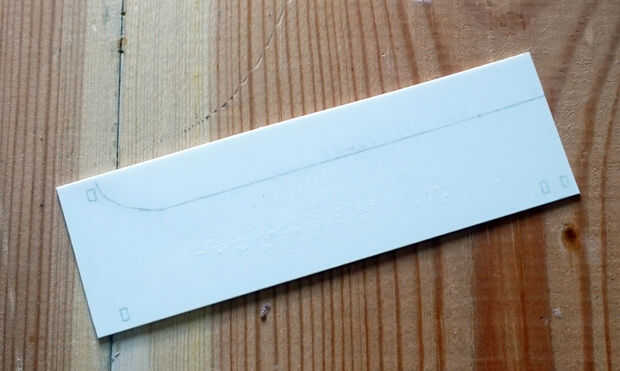 Usar plástico tarjeta de 1,25 mm de espesor, cualquiera va a hacer como es rígido. Corte 2 piezas de plástico de la hoja, 35mm 115 mm. Estoy desesperada en el corte exactamente por lo que mina un poco más largo y más ancho, les sujetan juntos y lija los bordes hasta que iguale. Si el plástico es brillante entonces sólo la arena sobre él rápidamente con un papel de lija 600 o 800 hasta que el brillo se apague.