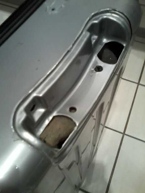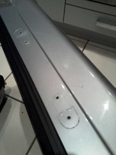 Haz tus tijeras y cortar pequeños agujeros en el revestimiento (en este ejemplo es una tela negra) detrás de las ruedas y asas. Esto va a descubrir las fijaciones que sostienen las asas / ruedas.