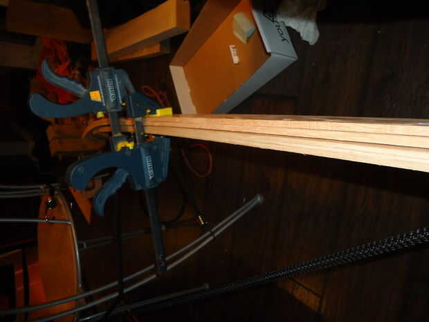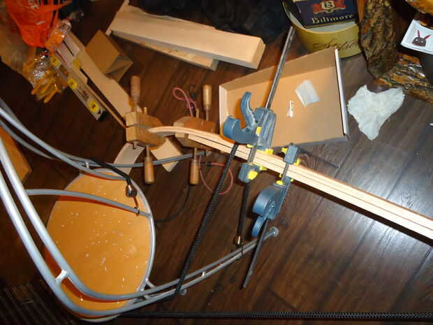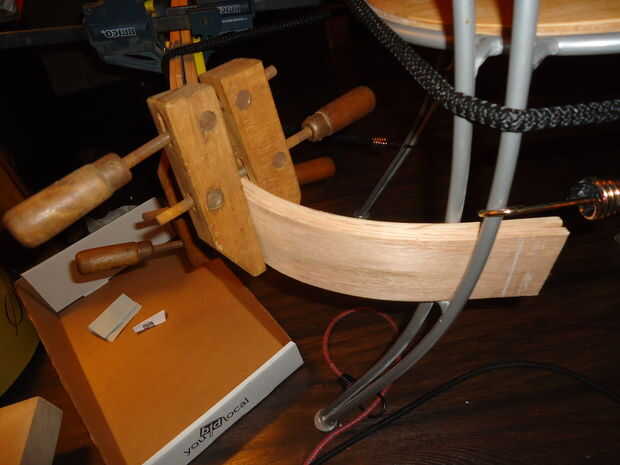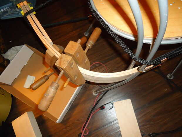 Por lo que siempre he querido doblar madera pero nunca han hecho antes. Armado con el conocimiento de ver un par de vídeos de YouTube en el edificio del barco tomó los dos esquís roble (2 ½ "x ¼" x 48 ") y los extremos en una olla grande de agua hirviendo sobre mi estufa y envuelto les en papel de estaño cerca de un tercio del camino para mantener tanto el calor y la humedad como sea posible. Luego creé una plantilla simple de una tabla de desecho roble que taladré agujeros para alguna espiga de 3/8"(esto fue a las 21:00 el sábado y yo estaba tan emocionada de comenzar no realmente creo que por mucho). Me tiró la primera pieza hacia fuera después de aproximadamente una hora y lo colocó en la plantilla y comencé a doblarla cuando tres de los tacos se desprendió y me quedé menos plantilla! Tiempo para alguna improvisación! Tenía una silla de metal que había espacio entre las barras que componen las piernas. Tomé dos cielos juntos y que encajen en este boquete. Entonces sujeta una tabla de ½" a lo largo de la parte de los esquís que quería mantener recto y procedió a doblar la madera alrededor de la pata de la silla. Me llevó un par de cuerdas del amortiguador auxiliar (para asegurar el material para el techo de un coche) y unido al final del roble y seguí aplicando presión hasta un obtenidos de la curva que más me gustaron. ¡ Entonces enganchado los cables al otro lado de la izquierda luego de 24 horas secar y silla y "cura".