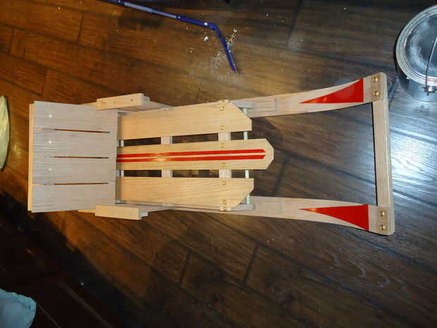 Se utiliza una tabla de ancho como el brazo de apoyo, con un tablero más estrecho corte en un ángulo para el respaldo de apoyo. Izquierda sobre Cruz ½ "x ½" Junta de miembros 1 se utiliza para conectar los dos (pegados y atornillados) junto con una pieza adicional horizontal para el resto del brazo. No visto en las fotos, son dos tramos de 1 "x 1" cuadrado stock atornillado en la parte posterior del asiento para actuar como estructura y proporcionar una superficie para atornillar en los tableros traseros. A la izquierda sobre la pieza de la pared posterior se utiliza para rematar la parte superior de la espalda del asiento. Un taco de ½" es perforado y pegado en el dorso. Esto quedo para sobresalen unas cuantas pulgadas en ambos lados proporcionan asideros de empuje y el trineo un poco de una sensación de trineo de perros por diversión.