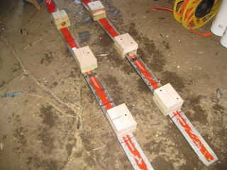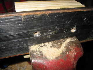 Coloque los bloques en los esquís por la explicación anterior y marque los extremos restantes de los bloques de los esquís. Encuentra los bloques a un lado y taladro de 1/8 orificios para los tornillos de fijación en cada espacio del bloque. No hay necesidad para avellanar puesto se hará en la parte inferior de los rieles. Voltee los esquís y avellane cada agujero que ha perforado. El avellanado es aceptar la cabeza del tornillo para que no sobresalga de la parte inferior del esquí rayar pisos etc... Marcar los bloques como delantero, medio y posterior. Ponga la estación de esquí en su borde en el suelo y coloque cada cuadra de la estación de esquí y marque los orificios del piloto. Recordar que habrá una izquierda y una derecha . Esto marca claramente en los esquís. Cualquier superposición de la madera debe ser el interior del trineo.