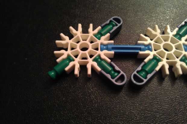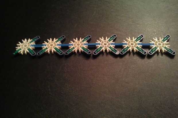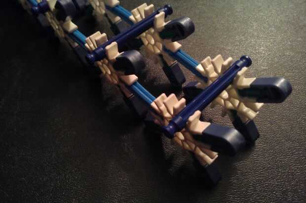 Iniciar con la construcción de seis renos como se muestra. Tenga en cuenta que uno no tiene una tapa azul en sus patas traseras. Conecte el reno con luz azul barra bendy "Reina," asegurándose de que uno con ninguna tapa azul en su pata trasera en la parte posterior. Repita el procedimiento para obtener dos filas completas de seis renos y conectar las dos filas con barras azules.