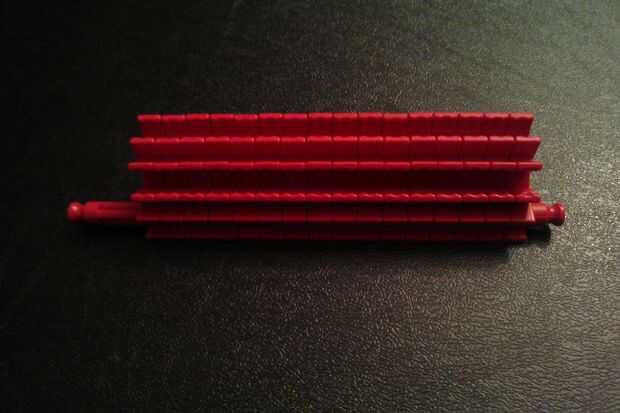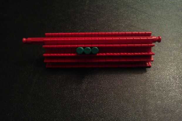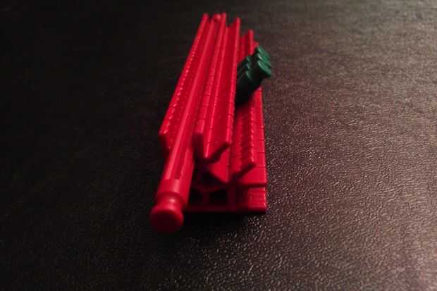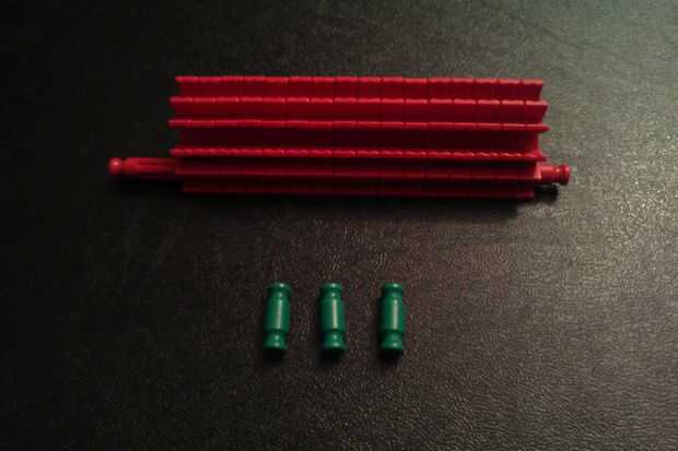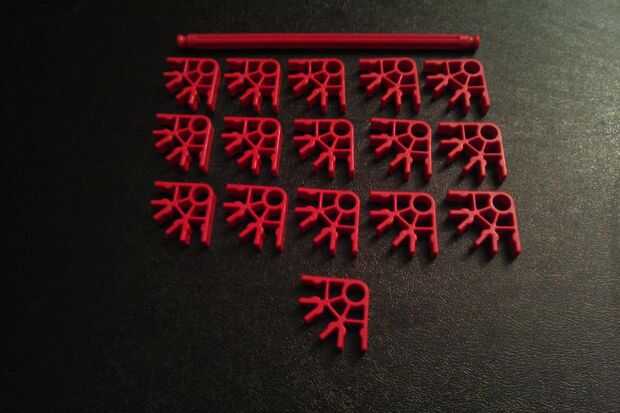Tomar 16 conectores rojo y fijarlos en una barra roja. A continuación, tomar tres barras verdes y conéctelos a los conectores de red donde se muestra (cerca de cinco conectores abajo de uno de los extremos).