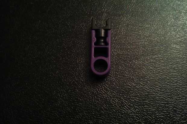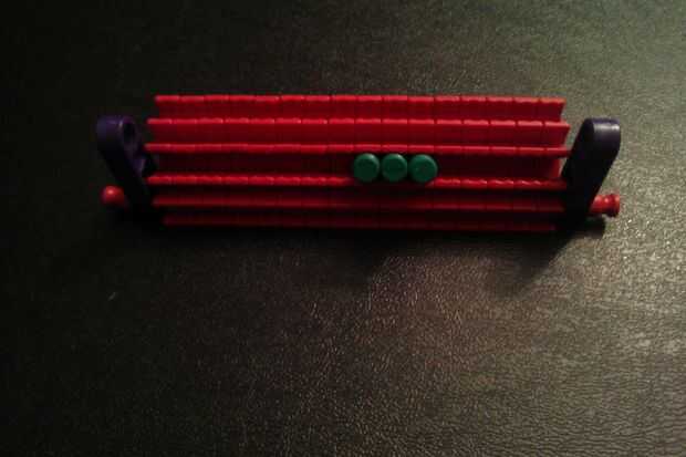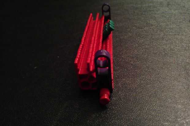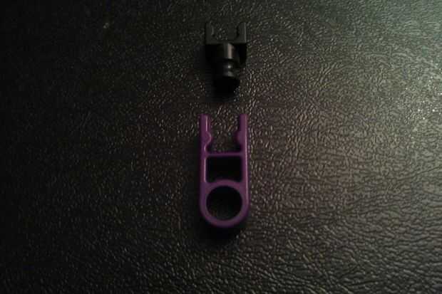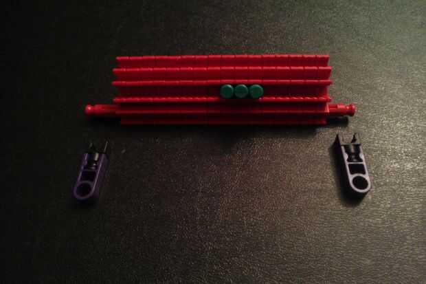 Conecte un conector de lazo púrpura a un conector en "Y". Repita el procedimiento para obtener dos piezas. A continuación, agréguelos a la barra roja en la obra que hiciste en el paso anterior.