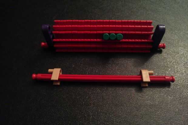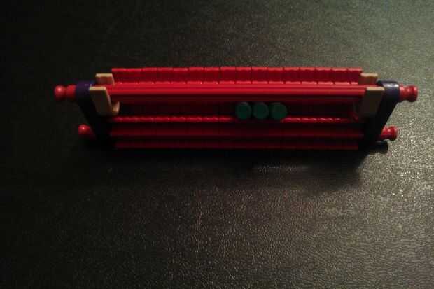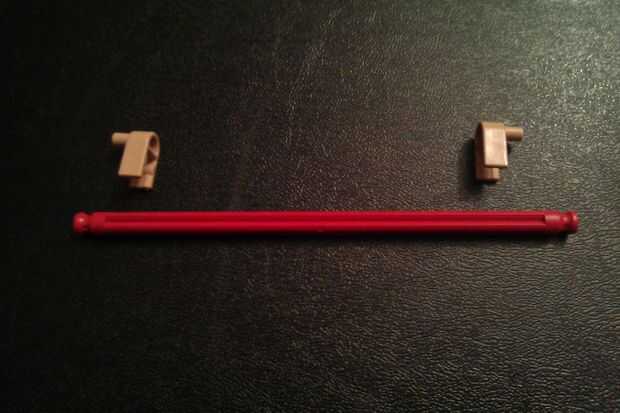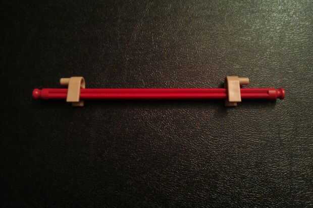 Añadir dos cerraduras de rotación tan a una barra roja como se muestra. Macho que se enfrentan a direcciones opuestas. Añadir a la pieza principal deslizándolo a través del lazo púrpura con las cerraduras de la rotación hacia abajo, como se muestra.