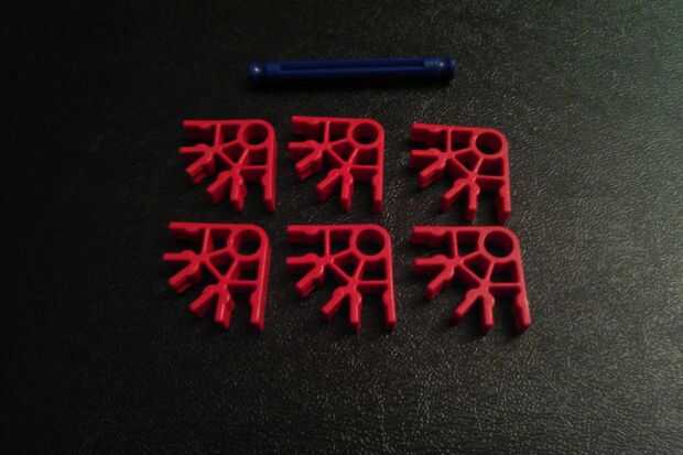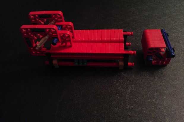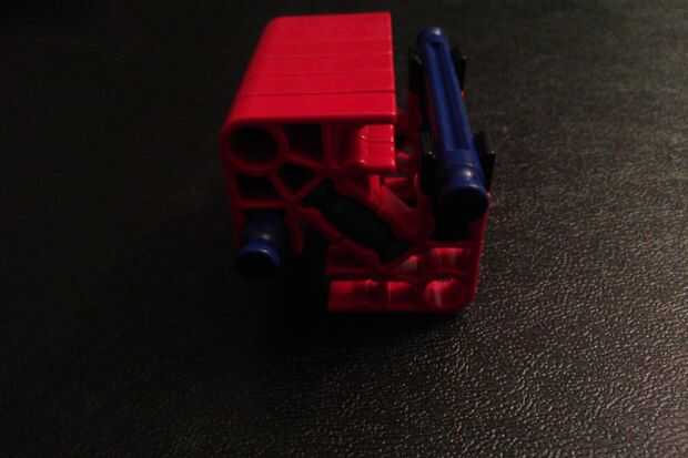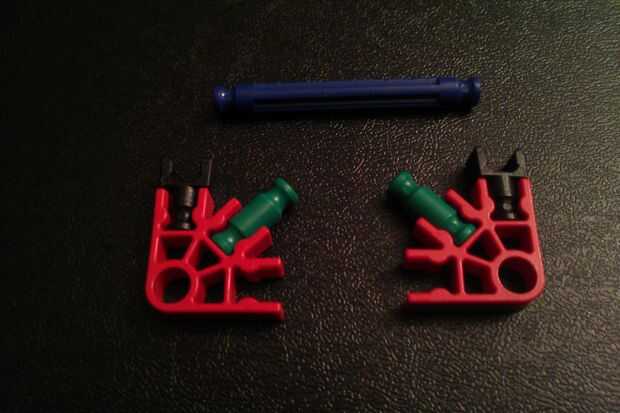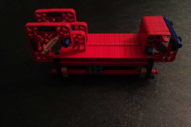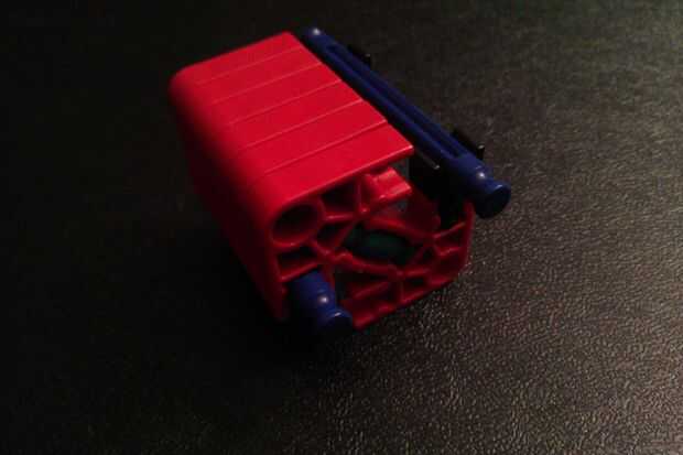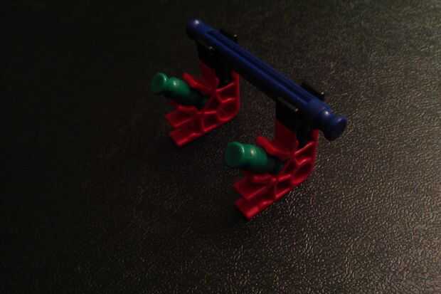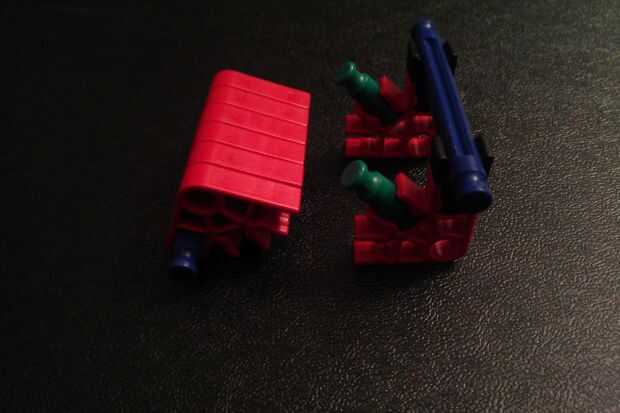 Tomar seis conectores rojo y fijarlos en una barra azul. A continuación, tomar dos conectores rojo con barras verdes y "Y" conectores y sujete a un azul rodas que se muestra. Finalmente, conecte las dos piezas juntas y conecte con el resto del trineo.