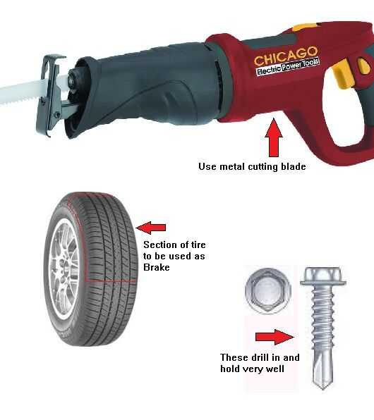 El freno consiste en un neumático viejo con tornillos perforados a través de él. Primero se corta el neumático usando una sierra de sable con una hoja de corte metal agresivo. Neumáticos de coche modernas tienen una increíble cantidad de metal bajo los peldaños. Yo corte a lo largo de la pared lateral y sólo cruzó la banda de rodadura para cortar directamente a través de. Luego se empernó la base y funcionó tornillos para chapa de metal a través de él en el otro extremo para el agarre en el hielo (Fig. 3).
