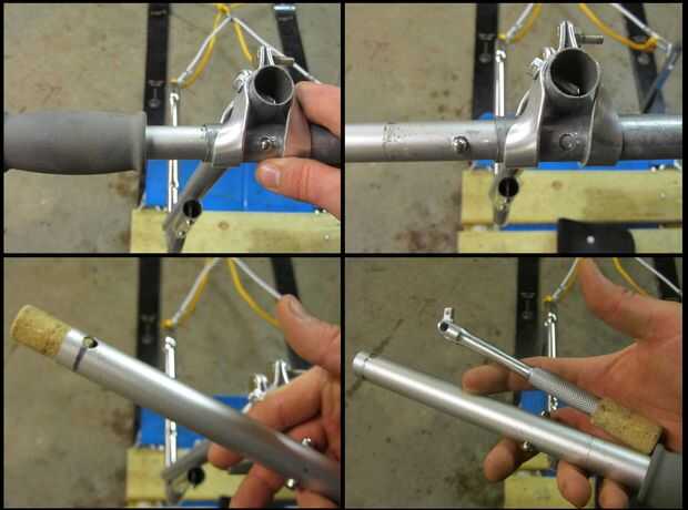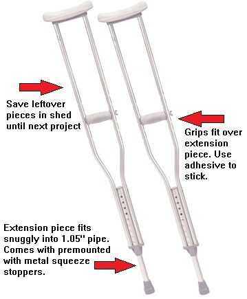 La barra de la manija estaba próximo. Usando el tubo de 1,05", amplió la altura de la silla de tubo empernando el tubo verticalmente a cada lado. Entonces conecté los dos tubos con una longitud terceros corriendo horizontalmente y conectores. Los puños se hicieron con la pieza de extensión en la parte inferior del par de muletas (fig.2) en conjunto con los apretones de mano. Estos Deslice perfectamente en ambos lados de la tubería horizontal de 1,05". Sujete con los tapones de squeeze preinstalada y unos orificios estratégicamente.